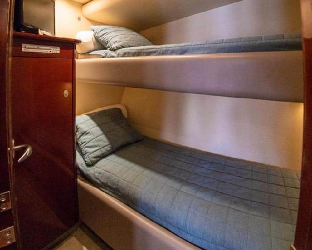 With capacity for up to 18 passengers, the yacht has been designed to ensure that each person enjoys spaciousness and privacy. Inside, it features three large cabins that comfortably accommodate guests, as well as two full bathrooms, guaranteeing comfort even on long days at sea.