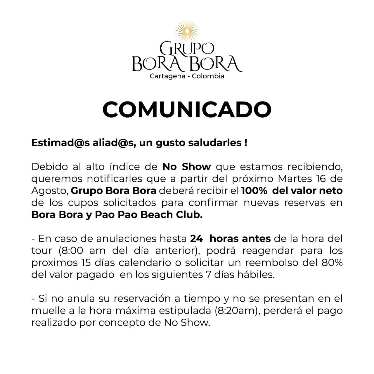 Las reservas se garantizan hasta las 8:20 a.m. del día del pasadía. Recomendamos puntualidad para evitar contratiempos, ya que la llegada estimada al muelle de regreso es a las 4:00 p.m..