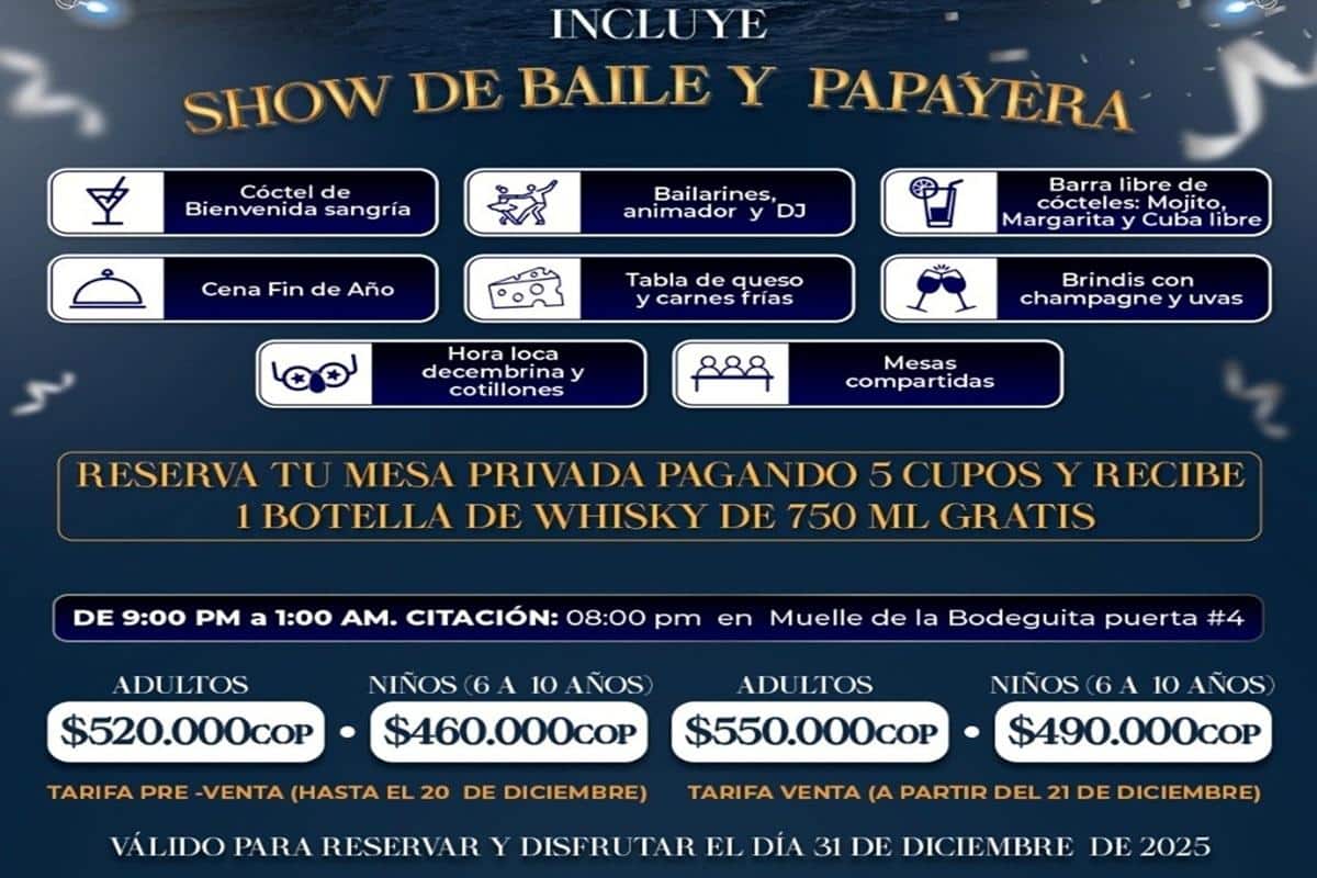 Reserva tu cupo hoy y celebra el Fin de Año como nunca antes: navegando bajo las estrellas, con la mejor música, excelente comida y el encanto inigualable del Caribe.