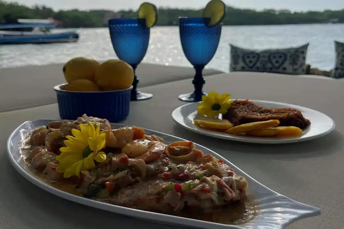 La experiencia en Dharma Beach Club incluye un almuerzo completo + bebida típica, preparado con ingredientes frescos y técnicas que resaltan los sabores del Caribe colombiano.