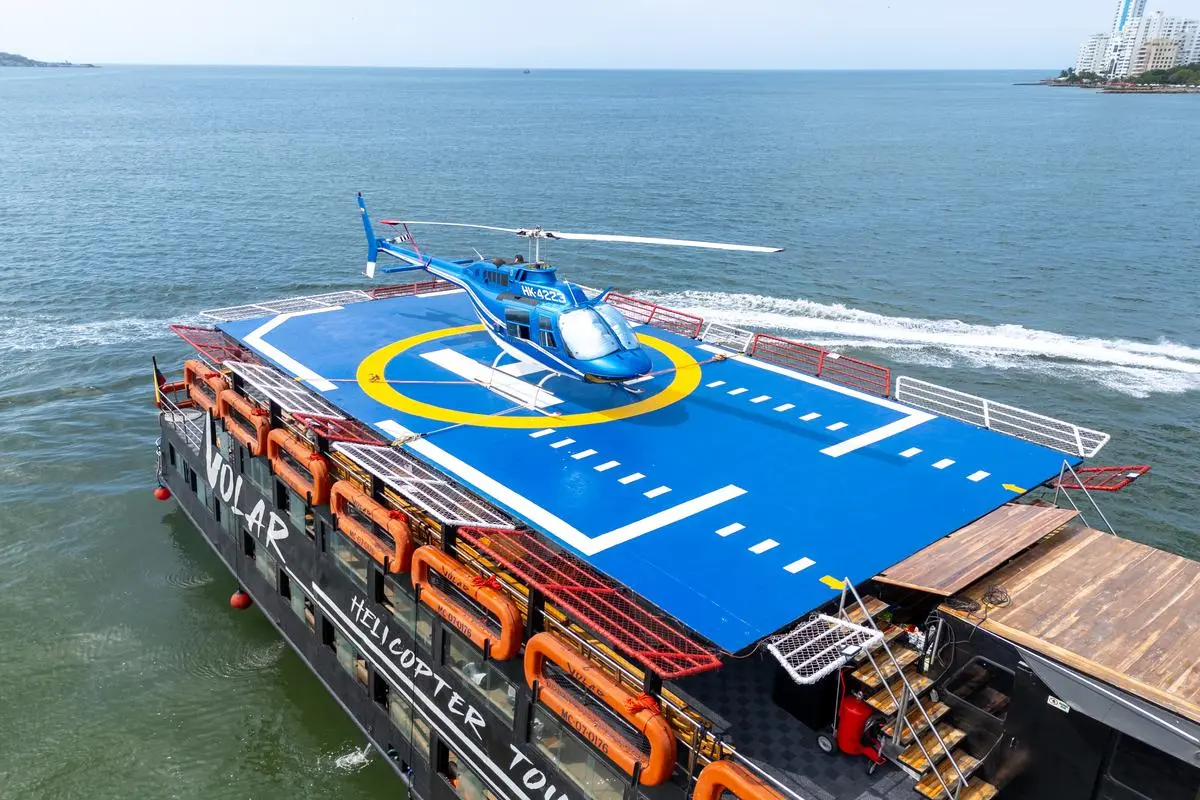 Este recorrido combina navegación por la Bahía de Cartagena, entretenimiento a bordo, gastronomía seleccionada y el momento más esperado: el sobrevuelo en helicóptero que permite admirar la ciudad desde una perspectiva privilegiada, reservada solo para unos pocos.